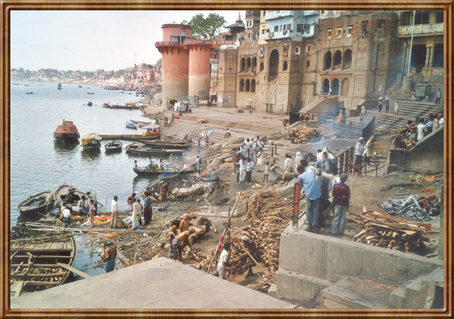 "Cremeerplaats aan de Ganges rivier. Rechts op het plateau: Een vrouw ligt in doeken gewikkeld tussen een zorgvuldig afgewogen hoeveelheid opgestapeld hout."